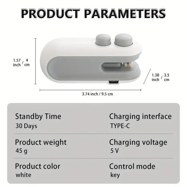Name: Home Sealing MachineWeight: Approx. 60gMaterial: Plastic, Silicone, Copper, Nickel, CeramicUsage: Sealing snacks, food bags, and more!Size: